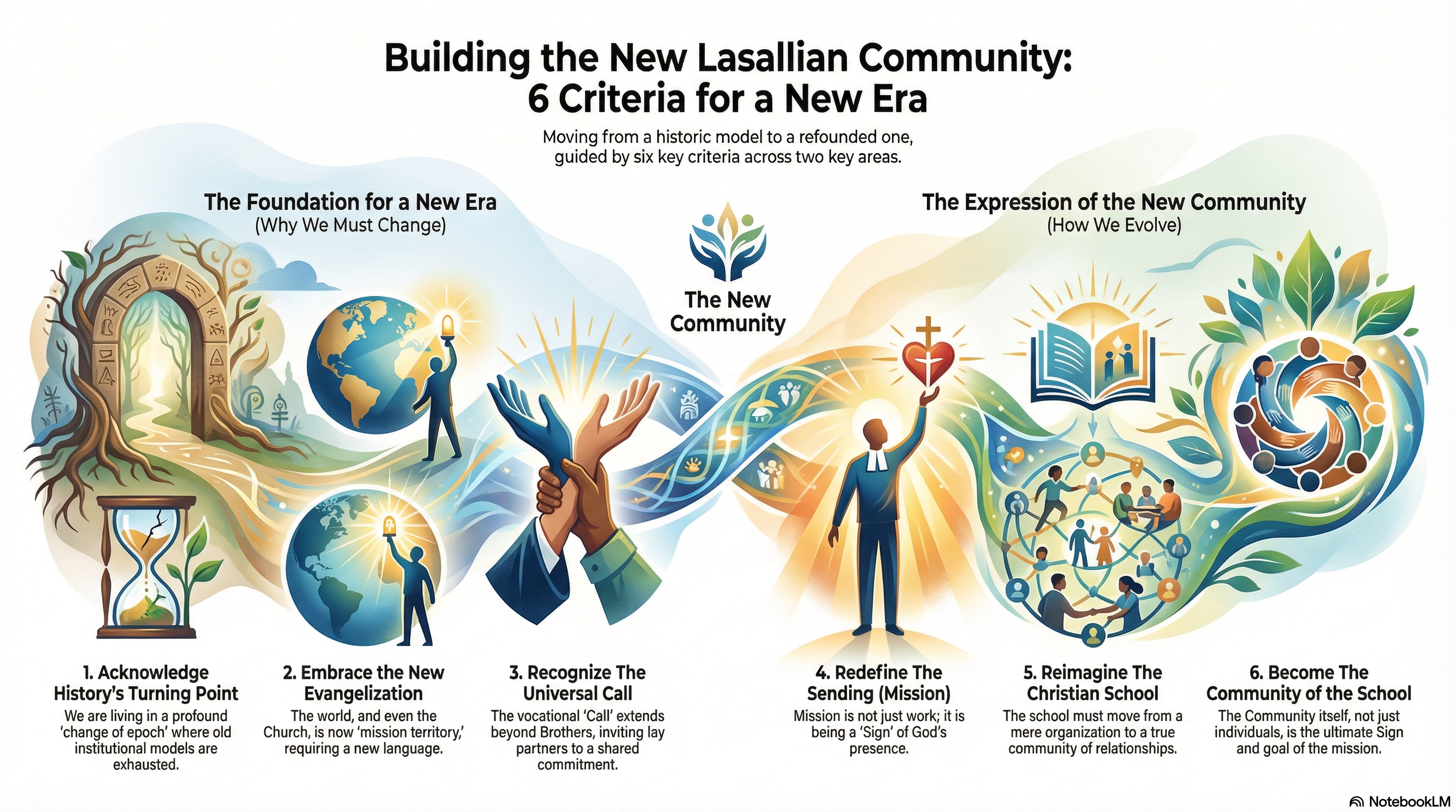 On the other hand, in the second volume, “The Interior Architecture”, he refers to the axes of the new Community and proposes six criteria for building it: (1) An Institution in History; (2) the New Evangelisation; (3) the Call; (4) the Commissioning; (5) the Christian School; and (6) the Community of the Christian School.